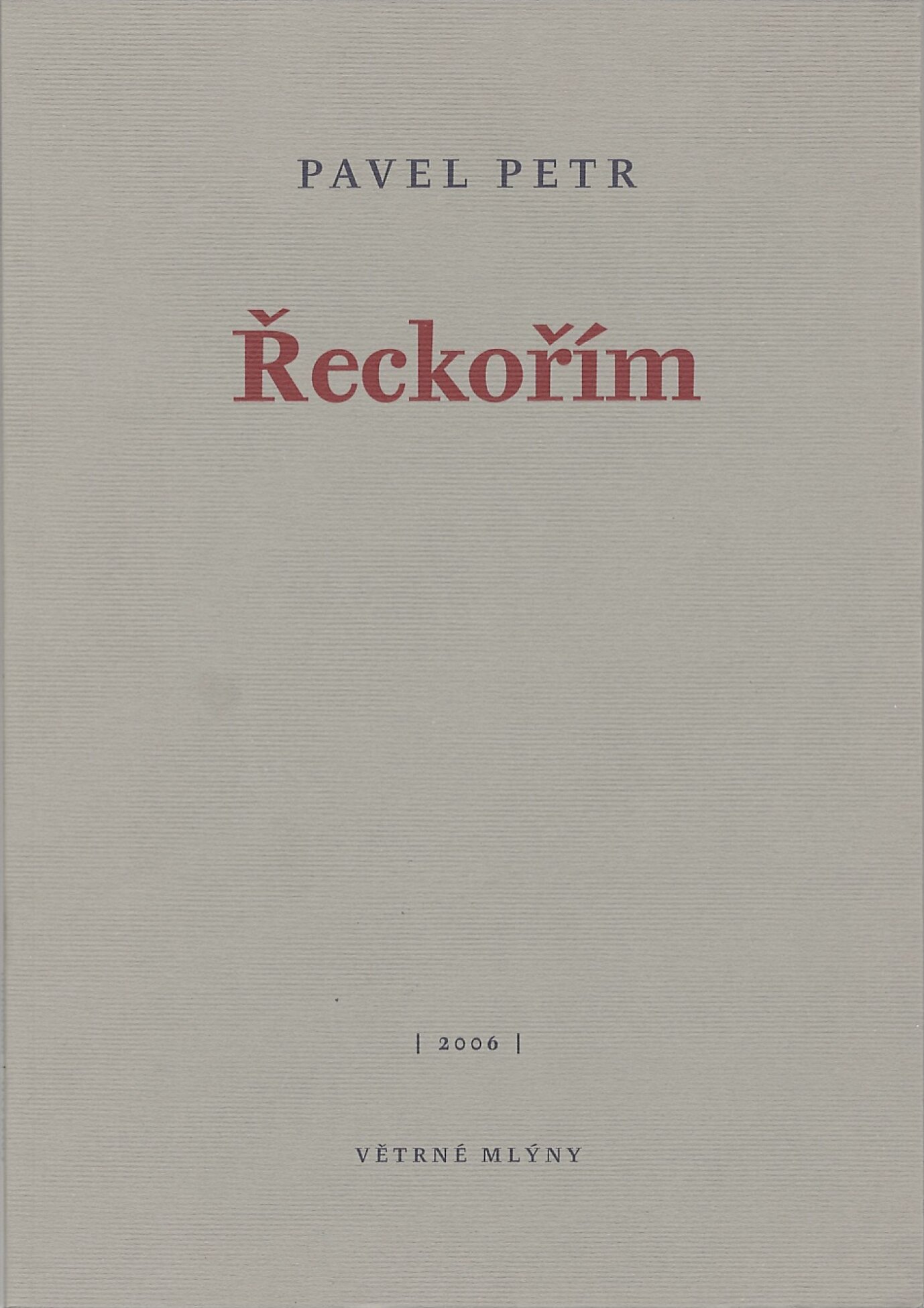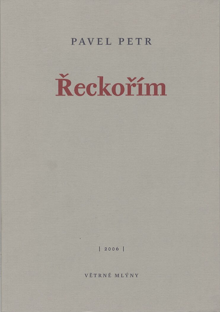 (...) šedesátistránková sbírka Řeckořím, dělená do samostatných, nicméně vnitřně zřetelně provázaných textů, titulem naznačuje jednak antické filiace, jednak autorskou vůli k práci s řečí – k jejímu koření, ba dokonce pokoření. Obojí nachází v knížce svoji rezonanční desku, byť v různé míře a různé podobě. Antický ideál jinocha s plavými vlasy a rozkvetlou muskulaturou, v textu nejednou tuhnoucího do monumentální nahé sochy smáčené deštěm, případně slzami, koresponduje s živlem tělesnosti, který básník vzývá a sám bouří průběžně a intenzivně v celé knize. Když se tento jinoch, anebo synonymický „chlapec“, „dorostenec“, „kluk“, „přítel“ či „milenec“ vyhoupne na scénu, která je podobně jako předchozí autorské počiny zasazena do moravské krajiny, neboť „řečtí bohové vzdávají hold moravské zemi“, Petr jej zahlédá v oslňujícím „jasu“ a – i nadále budeme citovat básníkova slova – dotýká se jeho „krásy“; samotný prožitek doteku pak má svůj „půvab“, svoji „něhu“, pokaždé jde o soukromou „oslavu“ a „okouzlení“.